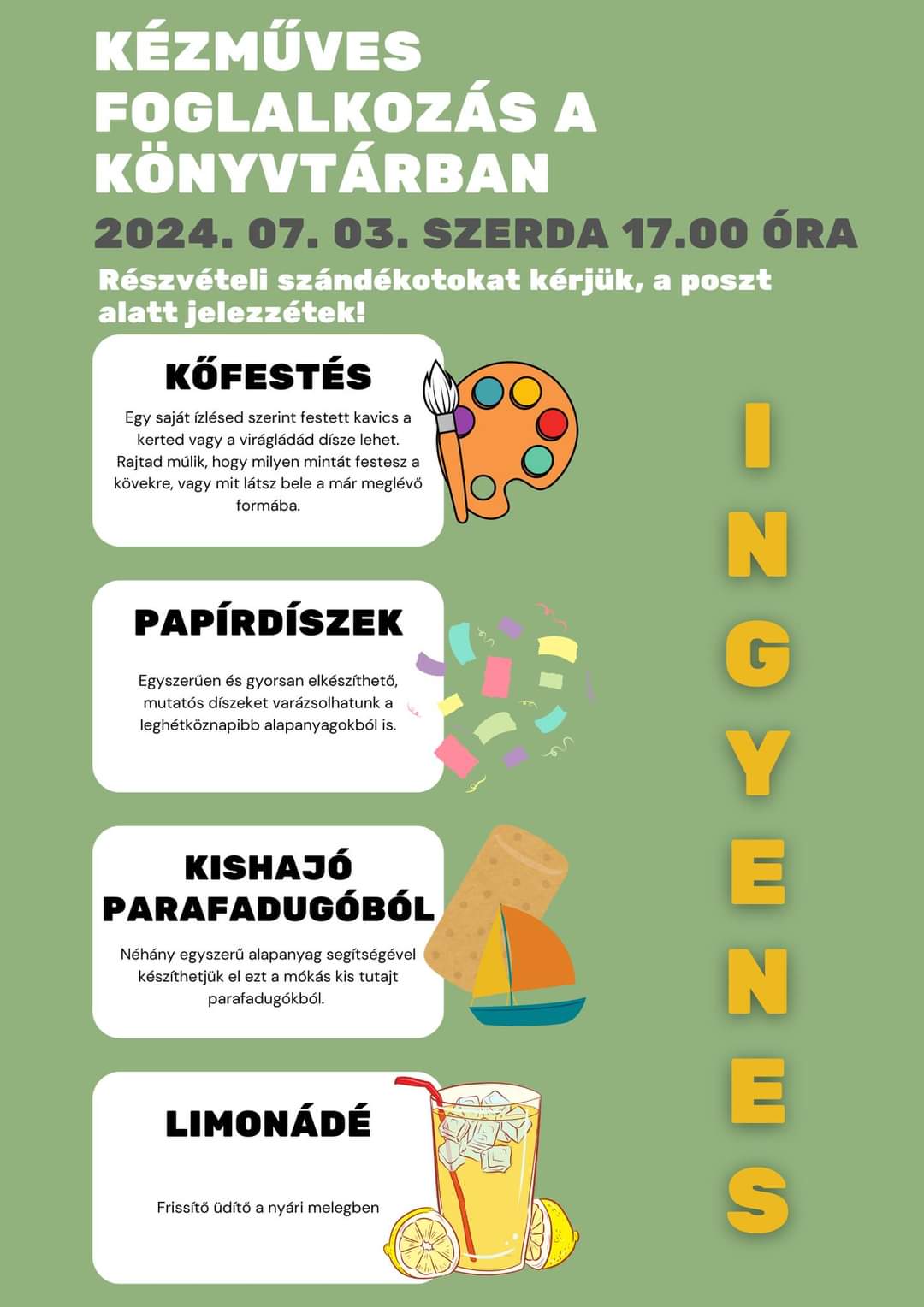 Ingyenes kézműves foglalkozást tartanak a táti könyvtárban 2024. július 3-án, szerdán 17 órától.
